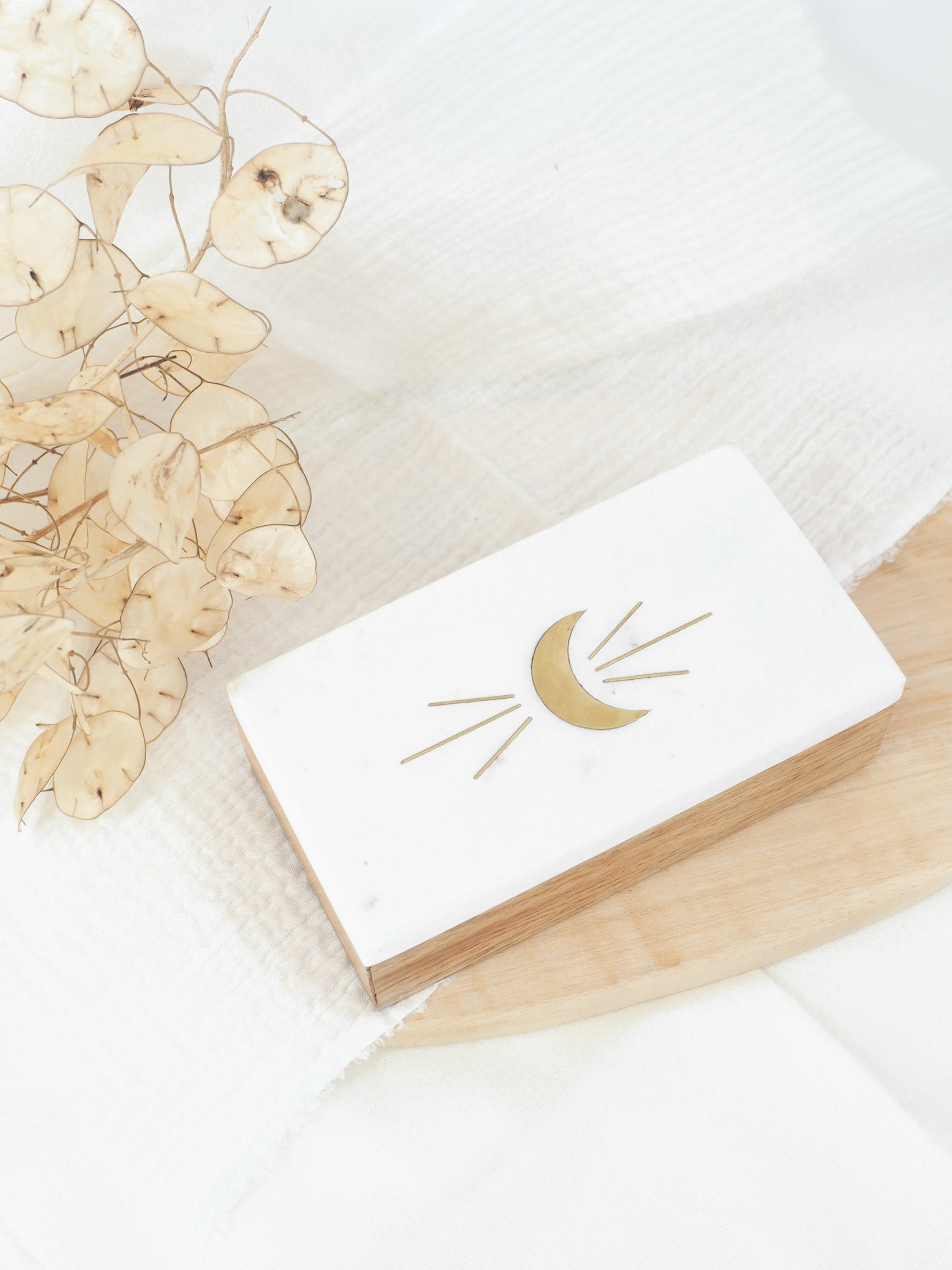 Boite rectangulaire en bois de manguier, marbre et laiton