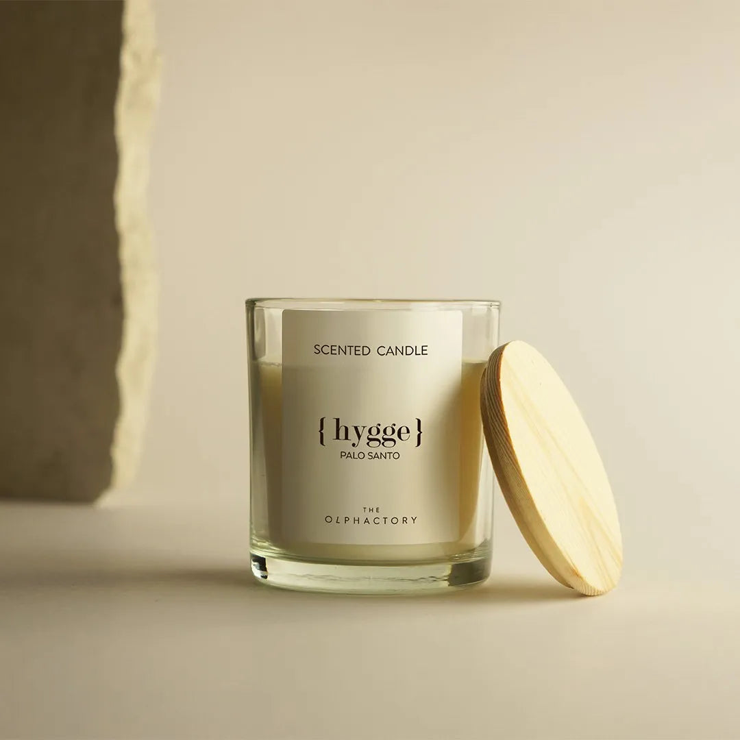 Bougie parfumée « Hygge » aux notes boisées.