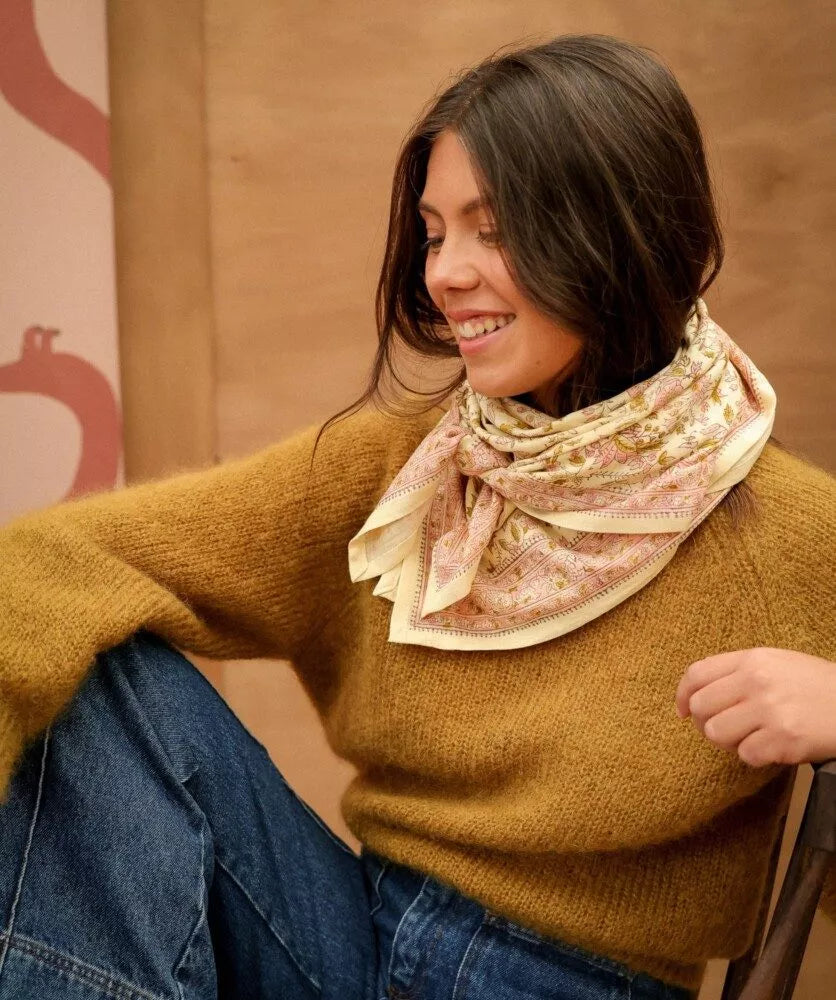 *L'impression au block-print est un procédé artisanal dans lequel chaque tampon destiné à imprimer le motif est gravé dans le bois puis imprégné de teinture pour être appliqué manuellement.