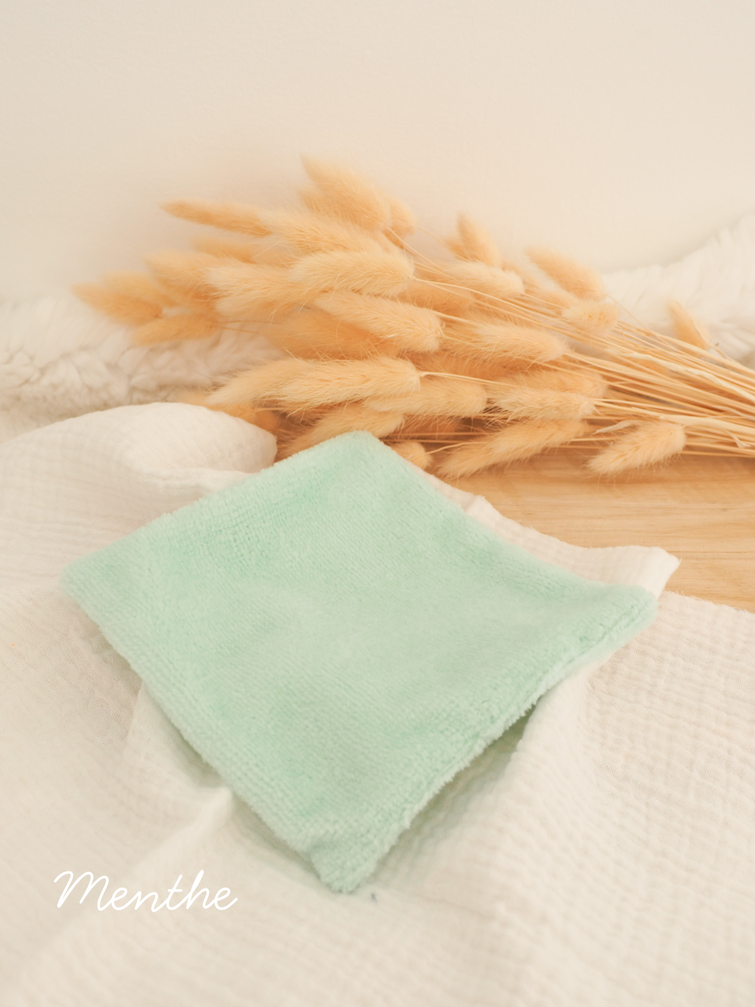 Ces petites lingettes sont bi faces et s'utilisent des deux côtés. Vous pouvez les passer en machine à 30°C dans un filet et les laisser sécher à l'air libre. 🌀