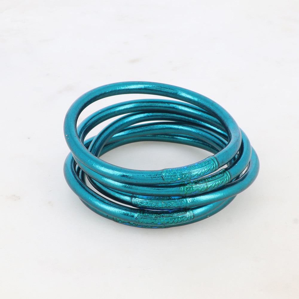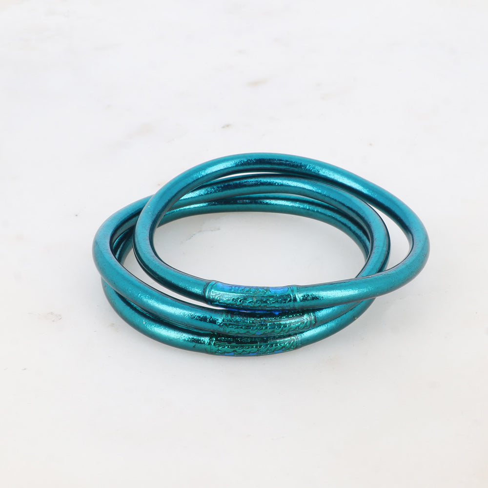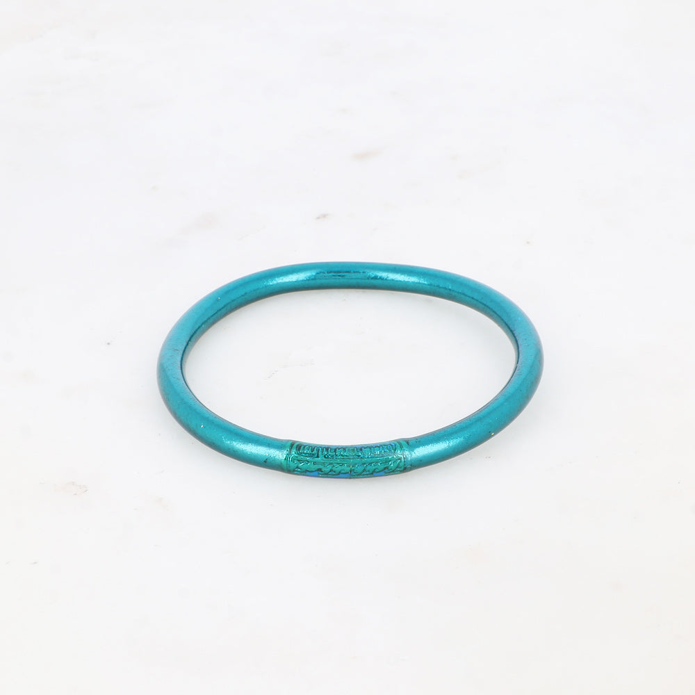 Jonc souple transparent remplis de feuilles dorées ou argentées décoratives épais avec un mantra gravé "Bonheur, Chance, Fortune et Amour" en thaïlandais.