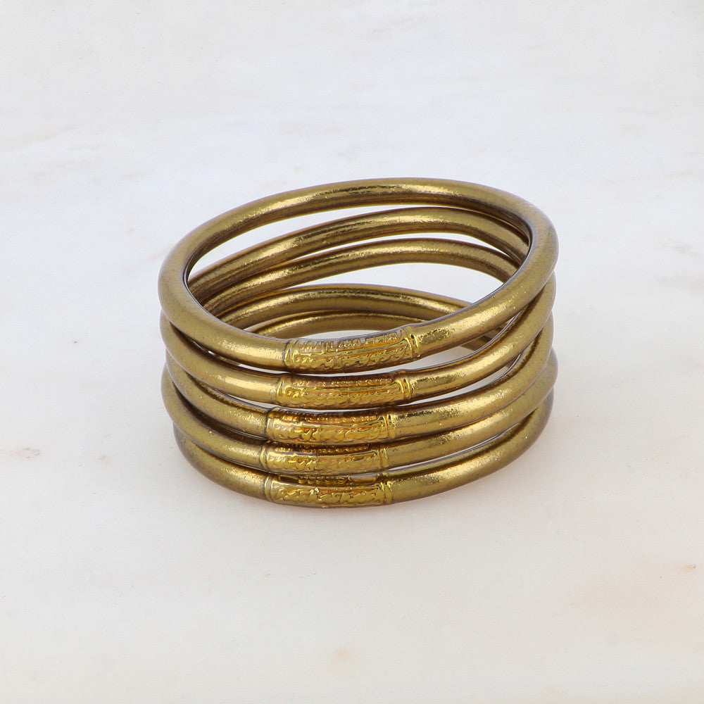 Jonc souple transparent remplis de feuilles dorées ou argentées décoratives épais avec un mantra gravé "Bonheur, Chance, Fortune et Amour" en thaïlandais.