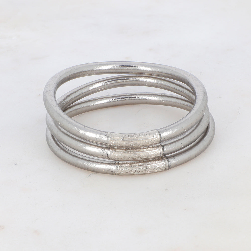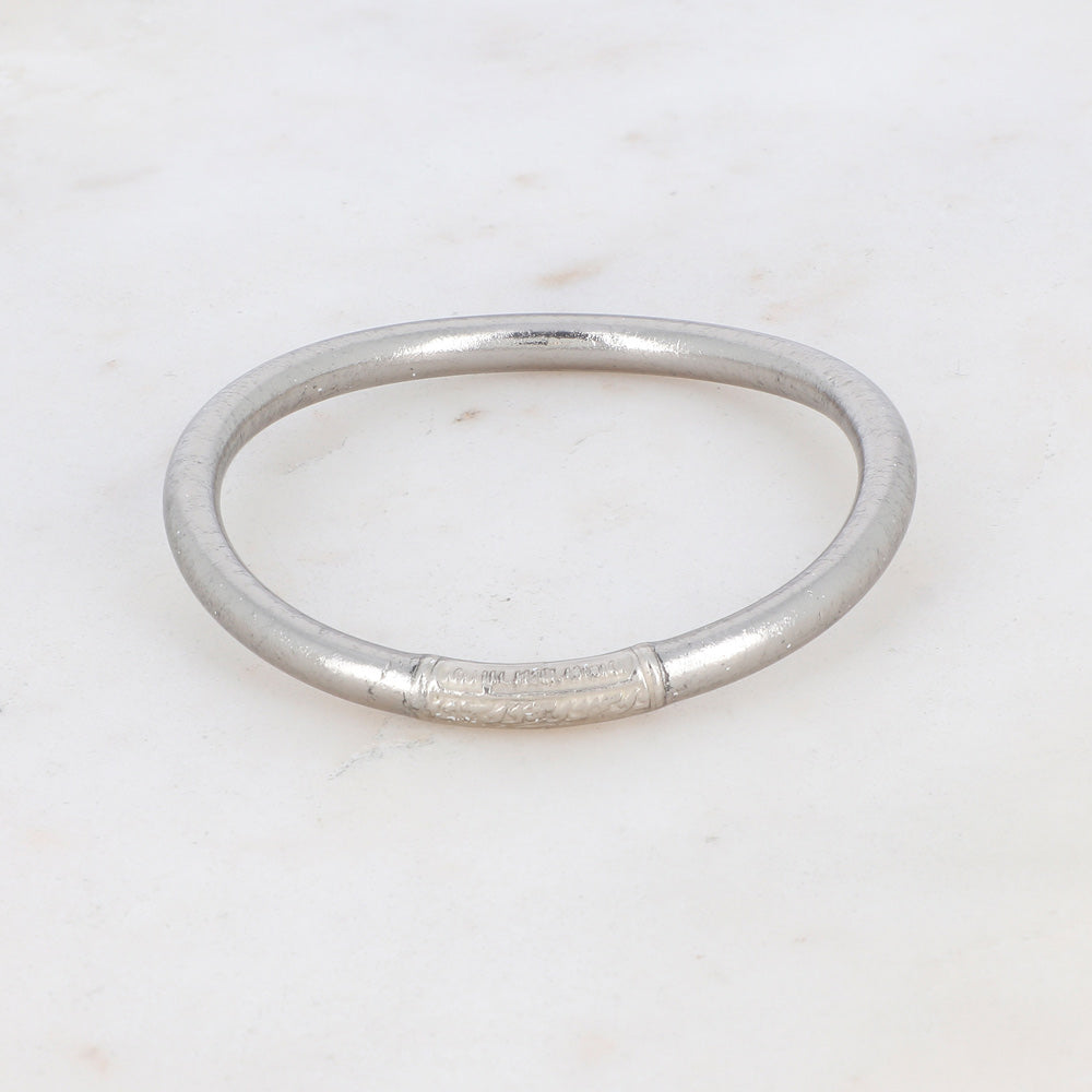Jonc souple transparent remplis de feuilles dorées ou argentées décoratives épais avec un mantra gravé "Bonheur, Chance, Fortune et Amour" en thaïlandais.